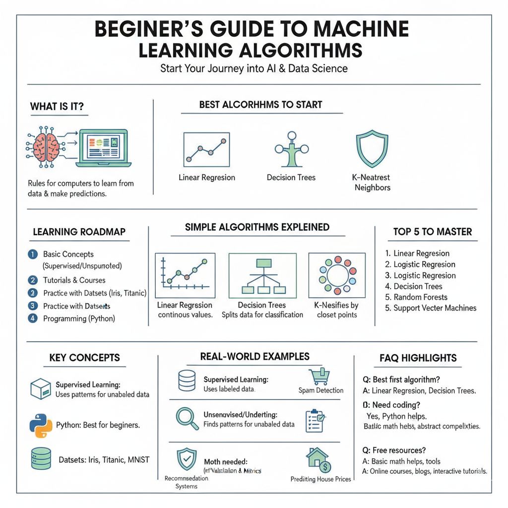 For beginners, starting with simple and widely used algorithms like linear regression, decision trees, and k-nearest neighbors is ideal. These beginner-friendly machine learning algorithm tutorials help establish foundational understanding before progressing to more complex methods.